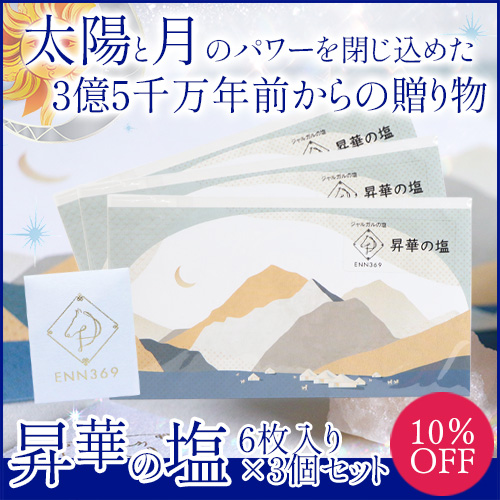 期間中、『昇華の塩』6枚入り×3個セットをご購入の方に、「昇華の塩」1枚をプレゼントいたします。財布やスマートフォンケース、バッグなどに入れて、金運アップや“浄化”などにご活用ください!
